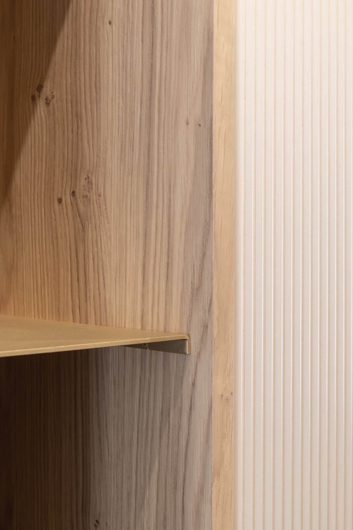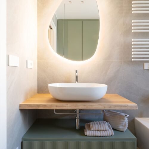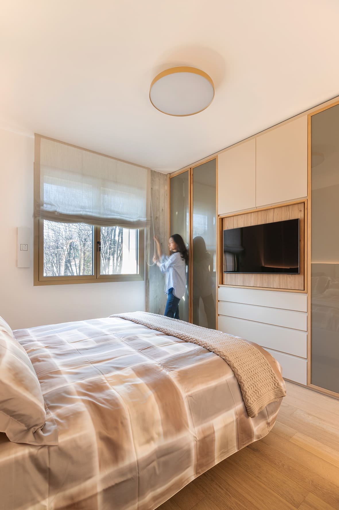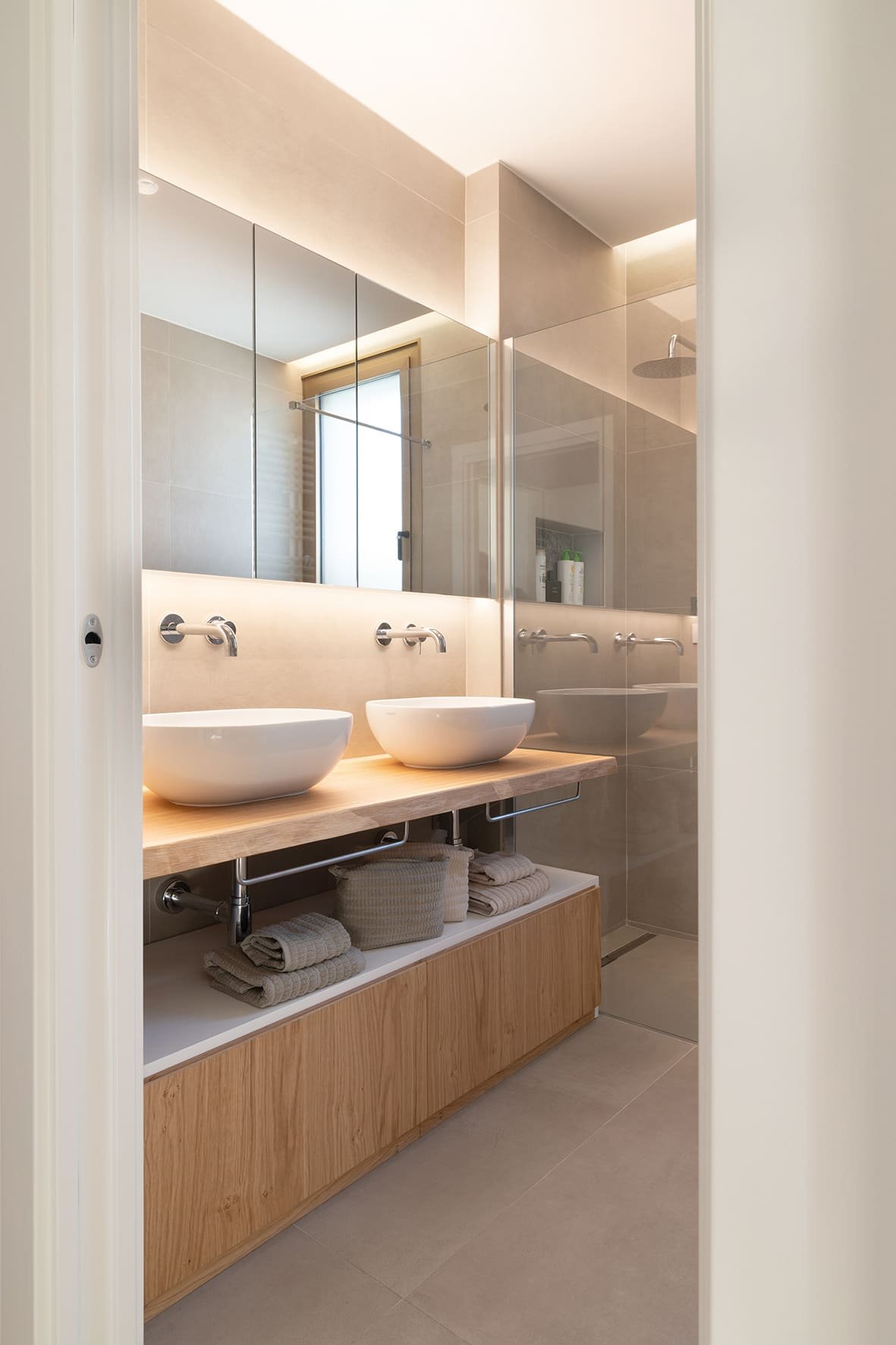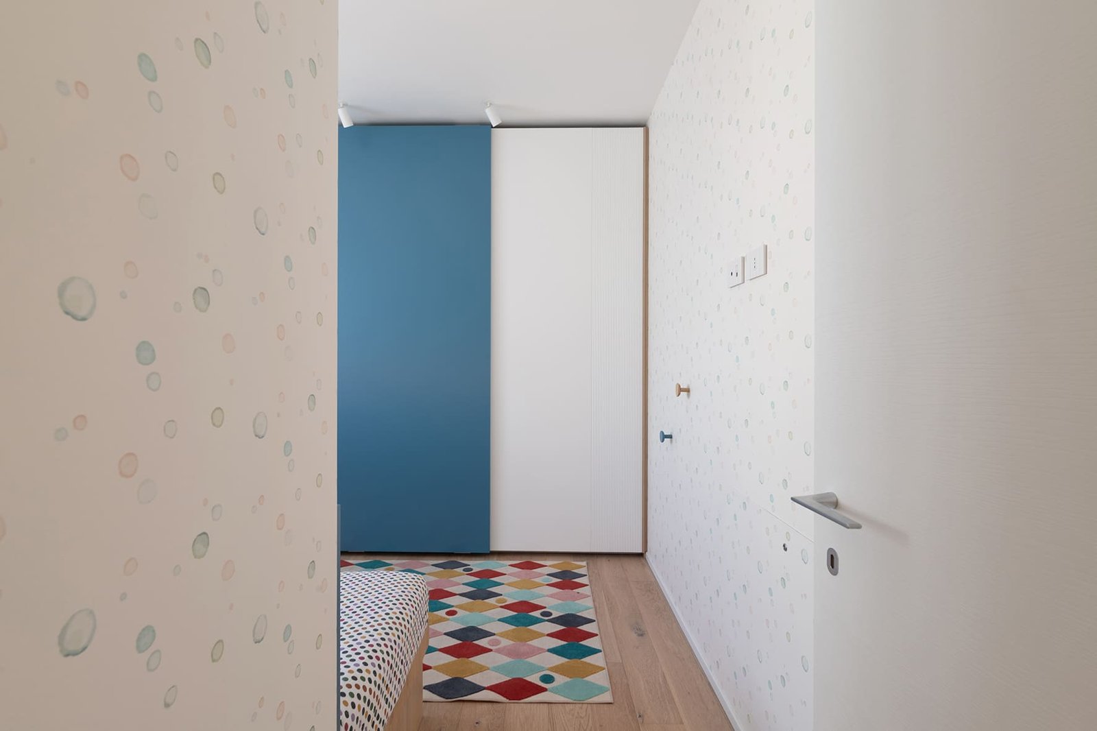 C’è un elemento silenzioso che attraversa tutta la casa: le fresature degli arredi. Abbiamo scelto un motivo che donasse movimento e “bossa” — quel ritmo delicato che rompe la staticità — trasformandolo nel filo conduttore che lega il soggiorno alla zona notte. Dalle camere con armadiature a muro integrate alla lavanderia “invisibile”, fino alle specchiere disegnate esclusivamente per questa famiglia: ogni centimetro è stato ottimizzato. Perché in 70 mq lo spazio non manca mai, se la progettazione è attenta a ogni singola esigenza quotidiana.